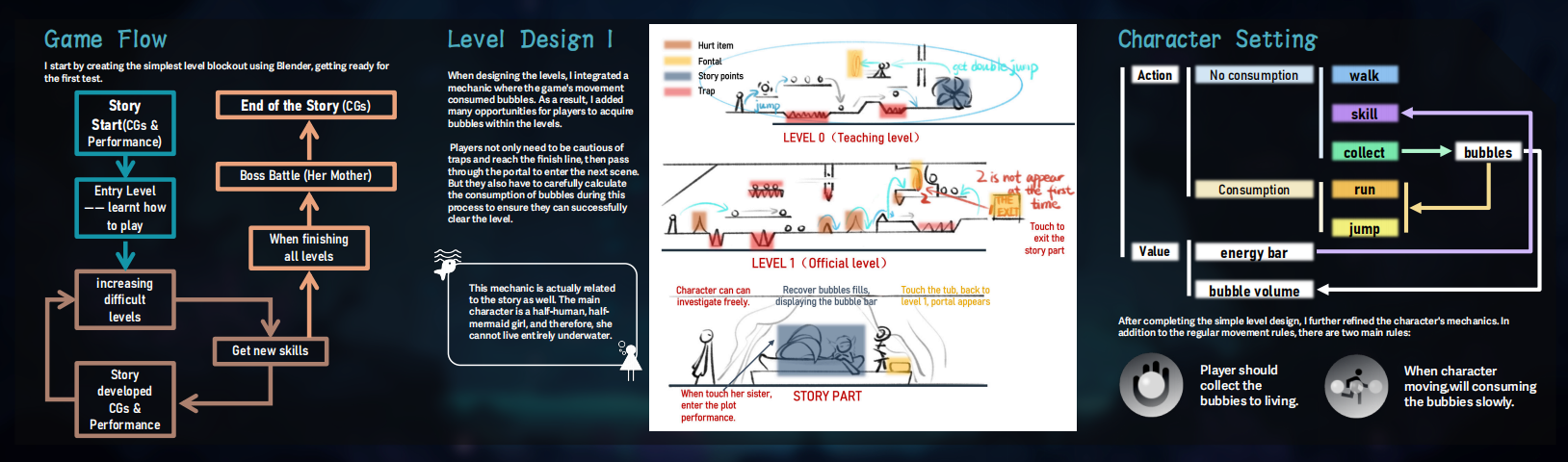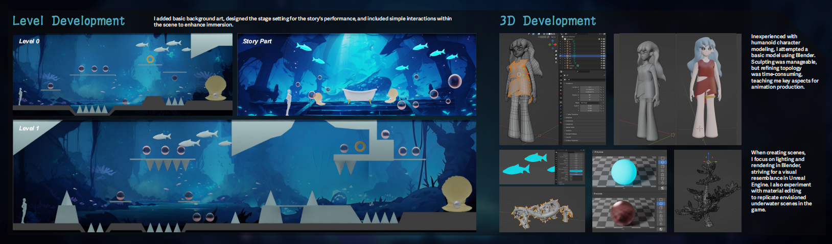 A 3D puzzle game in which the player takes on the role of a human/mermaid hybrid girl as she navigates through numerous underwater trials. This game aims to provide players with an immersive experience that allows them to experience the feelings and challenges faced by the HSP crowd, hence fostering understanding and compassion for HSP individuals.